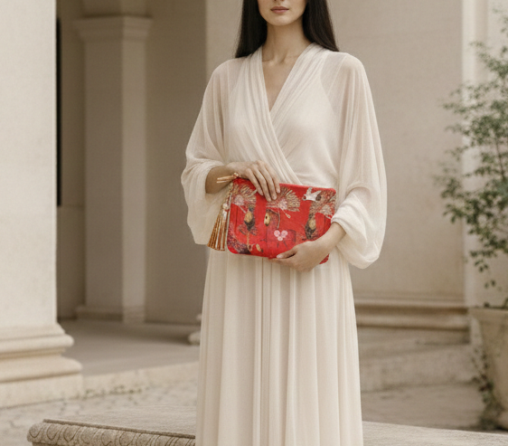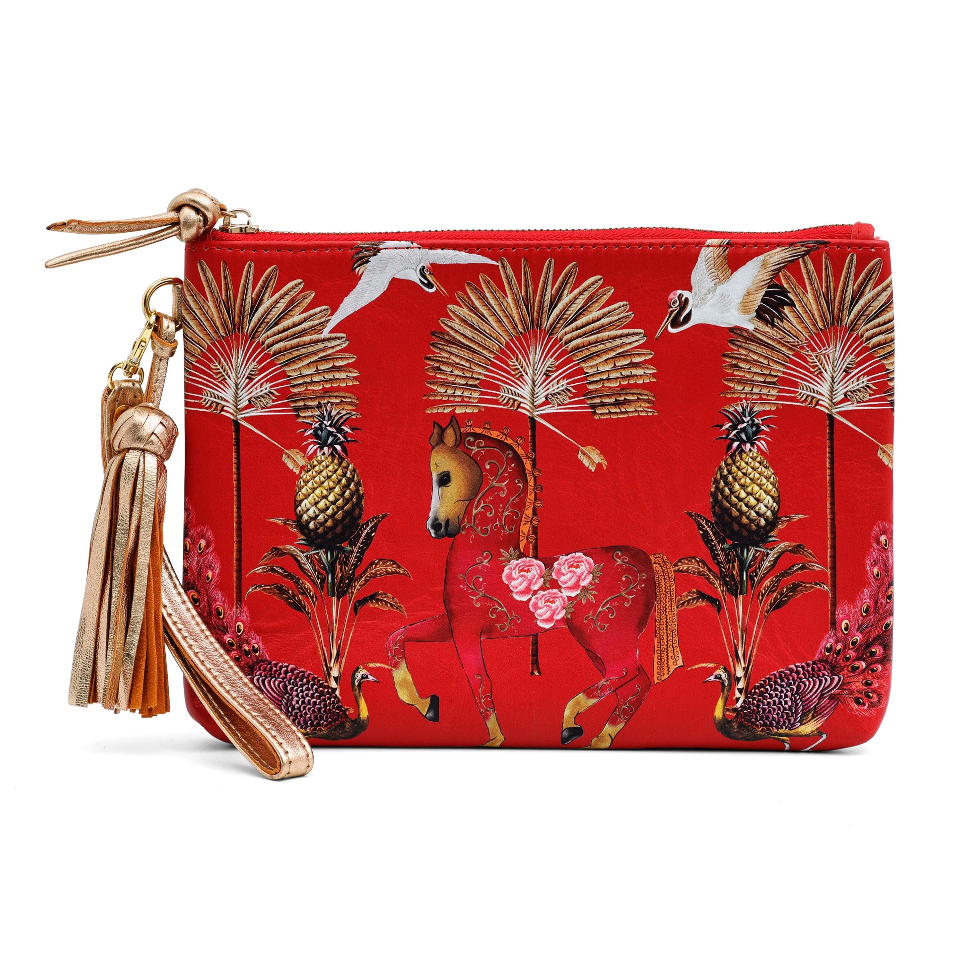 An exquisite leather clutch featuring a vibrant Art-Print of traditional Lunar New Year symbols set against a striking Crimson Red background. The intricate design showcases the Horse, Crane, Peacock, and Peonies—each a powerful emblem of luck, prosperity, and auspicious beginnings.
