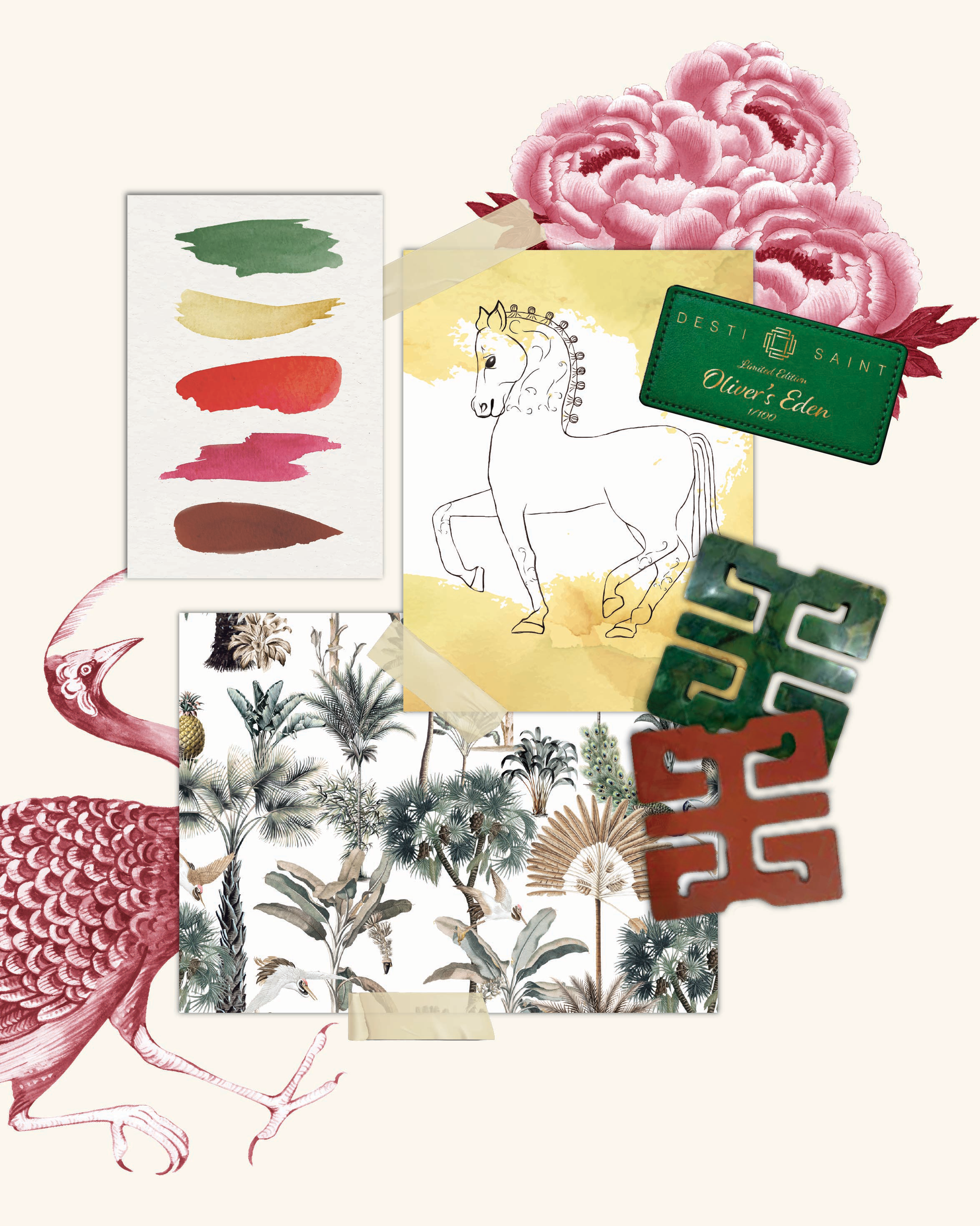 Inside, the lining reveals our Lunar New Year print — horses, peacocks, cranes, and peonies, each chosen for their associations with good luck, prosperity, and celebration for the season.