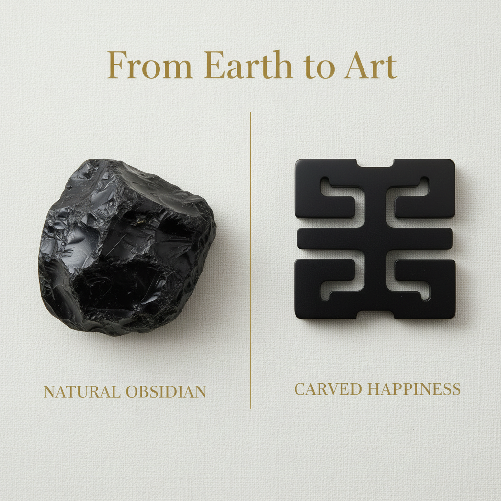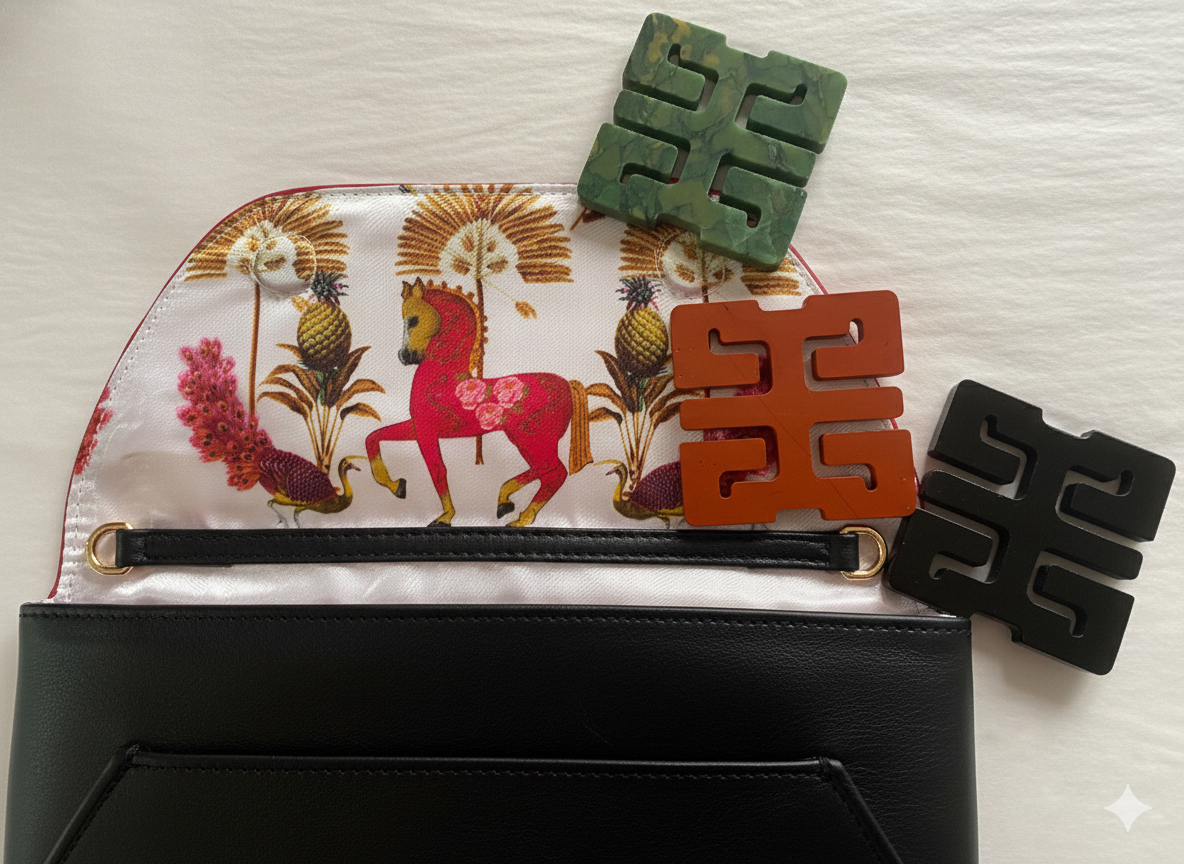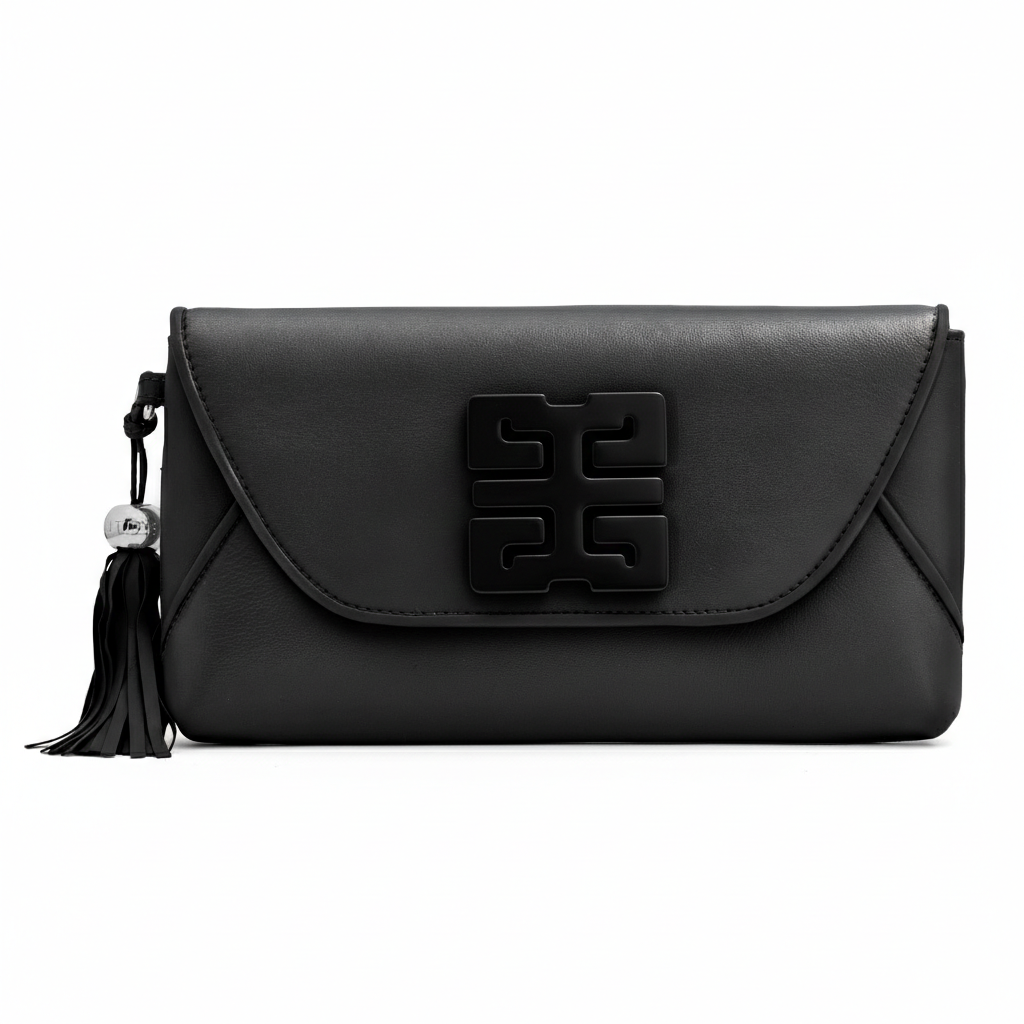 A soft black leather envelope bag finished with a Double Happiness Obsidian Stone ingot, known for its protective qualities and believed to help shield against negativity while offering a sense of grounding.